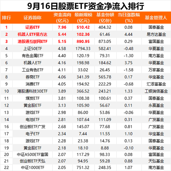 从单只产品看,证券ETF昨日净流入7.96亿元,位居资金净流入榜首。此外,机器人ETF易方达、港股通互联网ETF净流入资金均超5亿元,位列第二位和第三位。